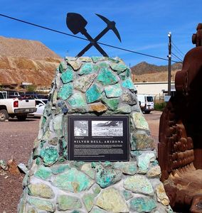 The Silver Bell Historical Society offers unique resources to researchers, scholars, and the public. History records four communities: Pelton (1881 - 1900), the Atlas Camp -- also named BS&K (1880 - 1964), the first Silver Bell (1902 - 1935), and the second Silver Bell (1952 - 1984). All of these towns of the Silver Bell Mountains have been deserted, although many who lived here share fond memories of a unique and fraternal place -- in the middle of nowhere in Pima County, Arizona. Located near Marana and Tucson. The photo above is the plaque which adorns our Monument, located at the entrance to the Silver Bell Mine at the very end of Avra Valley Road.